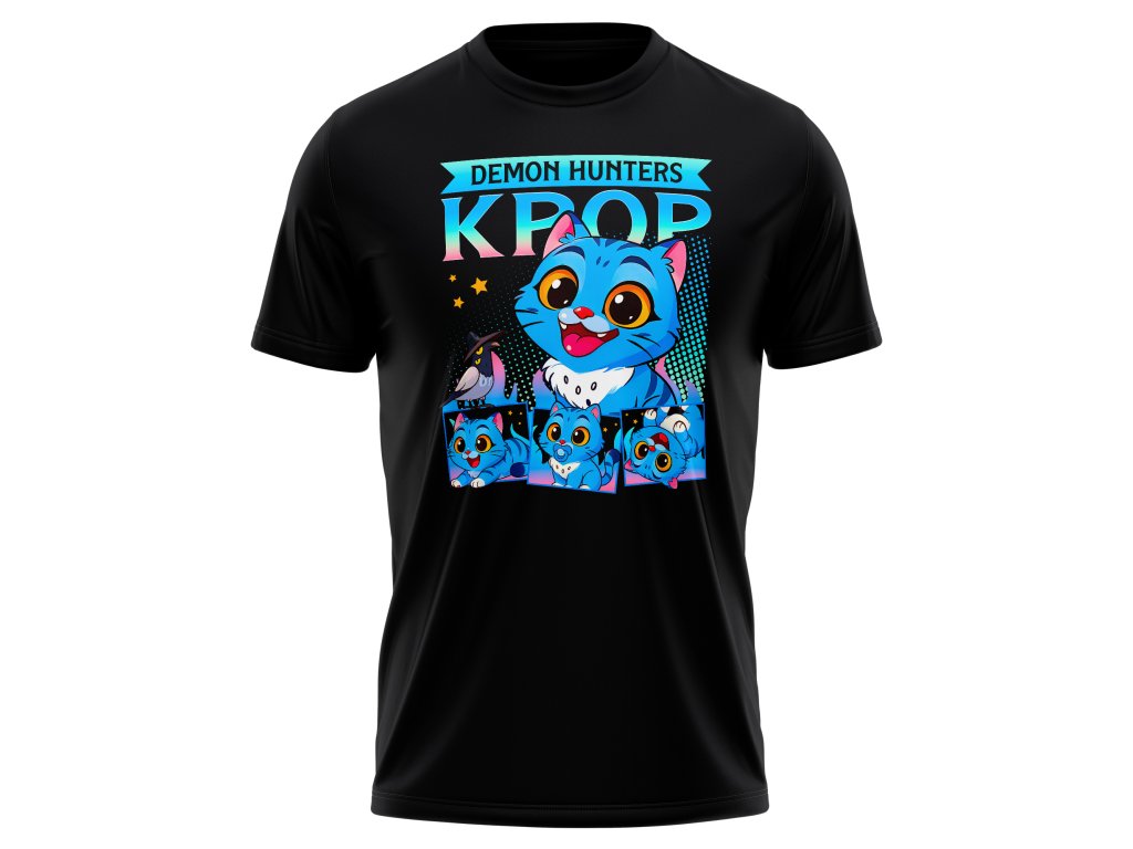 Modrý démoní kočičák v různých pózách, zářivé barvy, hvězdy a k-pop vibe… tohle tričko křičí „ano, jsem cute – a co má být?“. Ideální na cony, do školy, nebo jen na chill, když chceš rozdávat dobrou náladu všude, kde se objevíš.