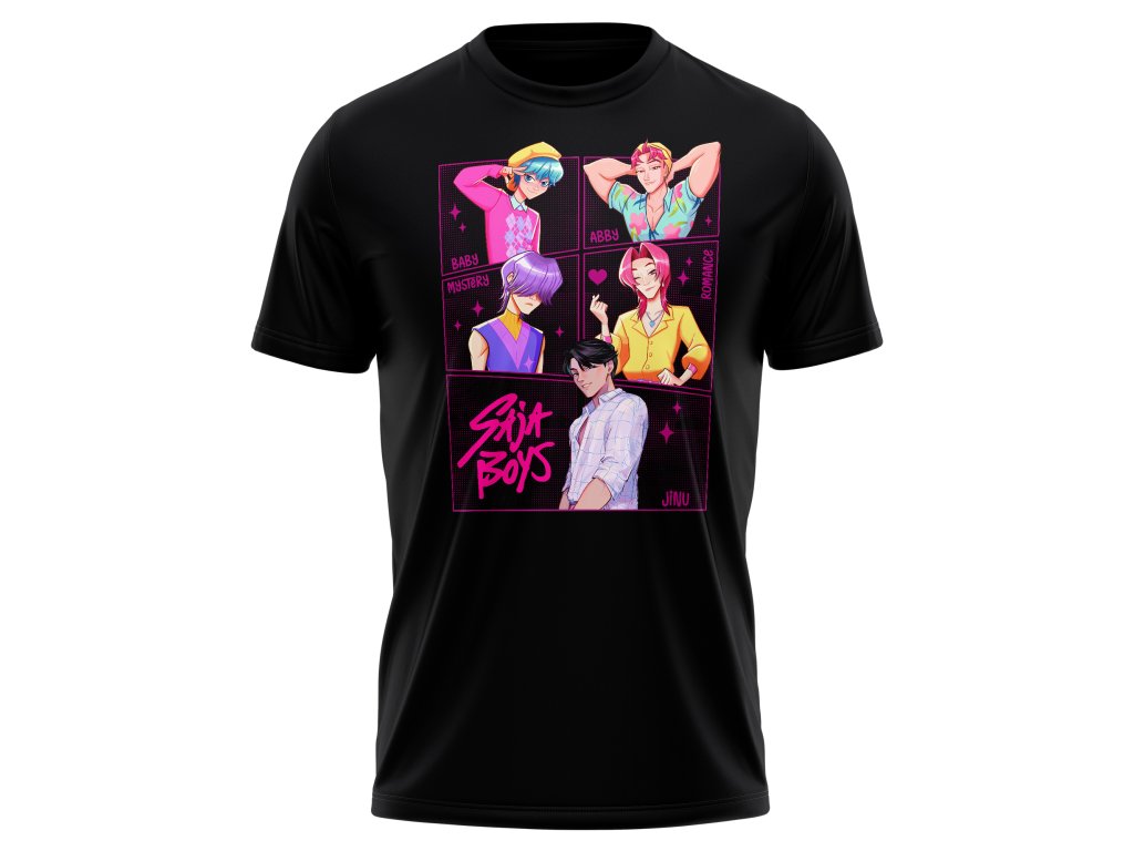 Tričko Saja Boys Set je absolutní povinnost pro každého fanouška K-Pop Demon Hunters. Celá pětice členů – Baby, Abby, Mystery, Romance a Jinu – tu září v plné idol podobě, v rámečcích připomínajících K-pop photocard set.